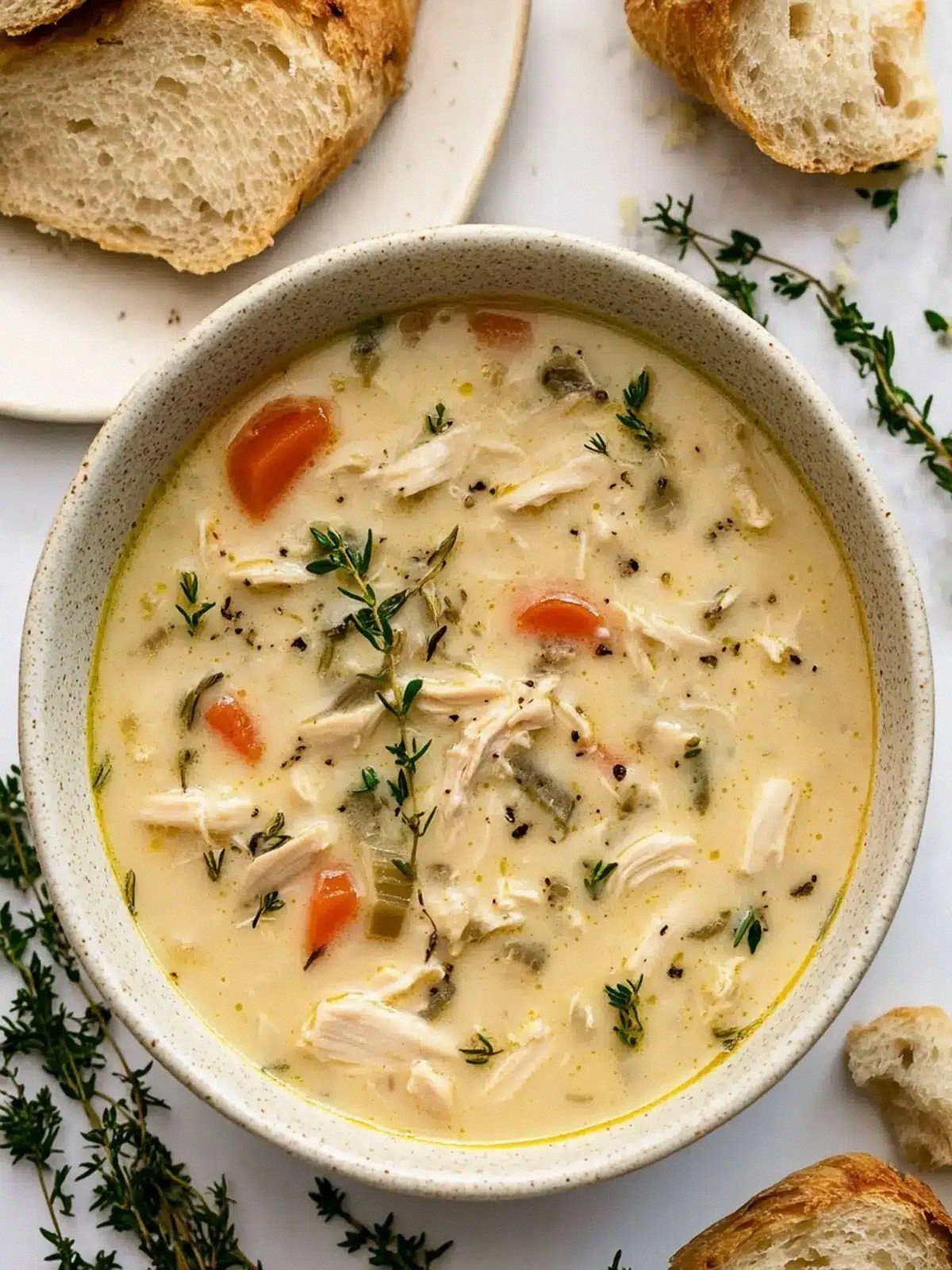 - Finally, fold in the shredded chicken and sprinkle fresh thyme leaves. Let the soup simmer for an additional 2 minutes to meld the flavors. Remove from heat, ladle into bowls, and garnish with a swirl of cream or a drizzle of olive oil if desired. Serve hot with crusty bread for dipping.