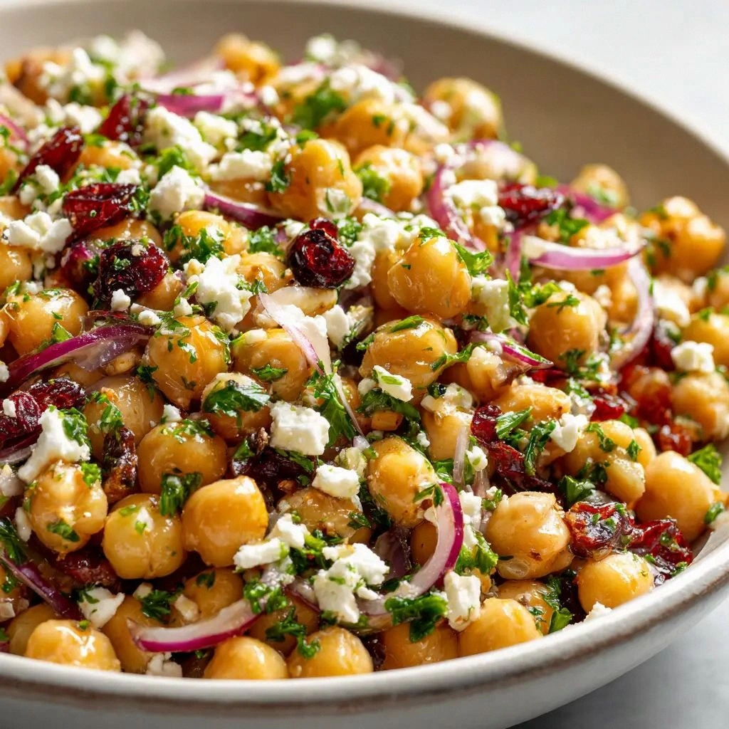 - Add the dried cranberries to the bowl. Toss them gently so they’re evenly distributed among the chickpeas and feta. The cranberries should be slightly toasted, so they release their juices and add a subtle caramelized flavor. This step is a game‑changer—watch the colors pop.
